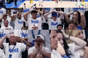 赛后,美媒及一些记者晒出了现场雷霆球迷在亲眼看到主队被绝杀时的表情,抱头捂腮几乎成为标配。