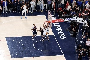 首轮G4,掘金客场101-99快船,戈登在最后时刻完成惊天压哨补扣绝杀。