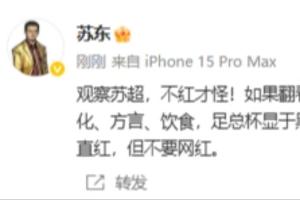 苏东:“观察苏超,不红才怪!如果翻看一下上世纪初的英国足总杯,何其相似!历史、文化、方言、饮食,足总杯显于黑板,苏超显于大屏。这才是足球之根,希望苏超一直红,但不要网红。 ”