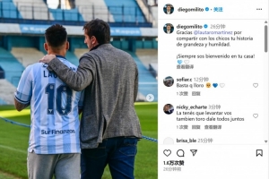 此次陪同劳塔罗一同访问竞技俱乐部的迭戈-米利托(迭戈-米利托也是竞技俱乐部的名宿)事后更新社媒写道:“感谢劳塔罗与小伙子们分享你关于伟大与谦逊的故事,这里永远是你的家,欢迎你!🩵🤍”