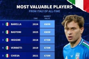 体育资讯6月7日讯 德国转会市场统计了意大利球员的历史最高身价,并列出榜单,巴雷拉、巴斯托尼8000万欧居首。