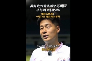 6月15日19:00,“苏超”第四轮,苏州队将奔赴客场挑战连云港队。此前据荔枝新闻报道,由于在苏超联赛战绩不佳,因此苏州队已经从每周1练调整为了每周2练。