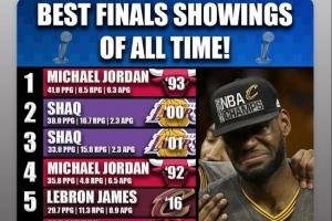体育资讯6月7日讯 今天,美媒INS排出了NBA单次总决赛个人表现Top10,奥尼尔进行转发,详情如下: