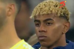赛后葡萄牙众将开心庆祝,此时镜头给到了西班牙队的亚马尔,亚马尔面无表情抿嘴。