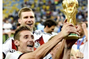 德国队官方社媒晒出克洛泽捧起大力神杯的照片,配文:“祝克洛泽47岁生日快乐!2014年世界杯冠军,世界杯历史最佳射手。”