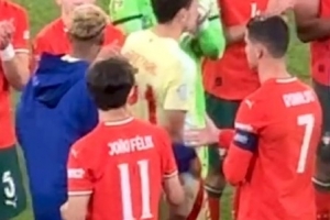 视频显示,赛后颁奖仪式,40岁的C罗主动伸手想和亚马尔握手,后者握手时则将脸侧向一旁。