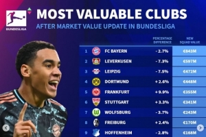 体育资讯6月10日讯 德转更新了德甲球员身价,拜仁全队总身价8.43亿欧德甲最高,勒沃库森、莱比锡排在二三位。