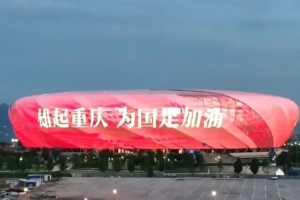 重庆市两江新区管委会透露,龙兴足球场及周边区域现已完成各项筹备工作,全力营造浓厚氛围,龙兴足球场的外立面也打出了“雄起重庆 为国足加油”的巨型字幕,龙兴足球场的外立面有46万颗灯珠,夜幕降临时整个外立面可以变成8万平方米的LED显示屏。