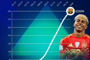 德转发布亚马尔身价变化视频,亚马尔刚满16岁时被德转赋予2500万欧身价,刚满17岁时直接破亿来到1.2亿欧,如今在18岁前达到2亿欧,不到2年时间便从0飙升到2亿欧。