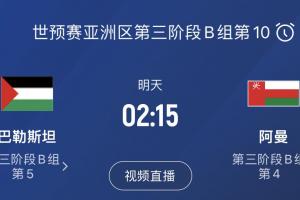 体育资讯06月10日讯 2026世界杯预选赛亚洲区18强赛末轮,FIFA排名第101的巴勒斯坦将主场迎战第77名的阿曼。