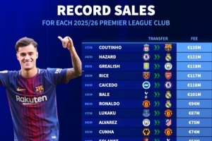 体育资讯6月10日讯 德国转会市场盘点了2025-26赛季20支英超参赛队伍的历史最贵球员出售纪录,库蒂尼奥的1.35亿欧元至今仍排第一。