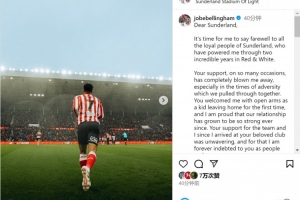 体育资讯6月10日讯 乔布-贝林厄姆更新社媒动态,与桑德兰告别。