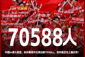体育资讯6月10日讯 2025年3月25日国足在杭州主场0-2不敌澳大利亚,据现场播报,本场现场观众人数达到70588人,打破中国足坛历史上座纪录。