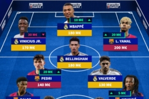 前锋:维尼修斯(皇马,1.7亿、下降3000万)、姆巴佩(皇马,1.8亿、上涨1000万)、亚马尔(巴萨,2亿、上涨2000万)