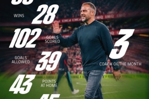 海报上列出,弗里克3次获得月度最佳教练,拿到88分,获得28场胜利,打进102球,只丢39球,主场拿43分,客场拿45分。