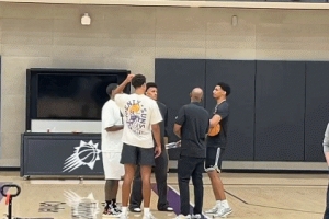 镜头捕捉到,太阳球员瑞安-邓恩、伊戈达罗、罗伊斯-奥尼尔和杰伦-布里奇斯都来到现场支持新帅。