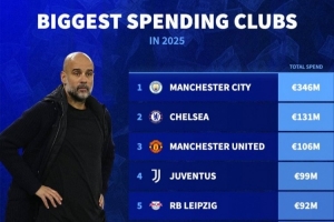 体育资讯6月11日讯 德转统计2025年各队引援花费,曼城3.46亿欧居首,切尔西1.31亿欧第二,曼联1.06亿欧第三。