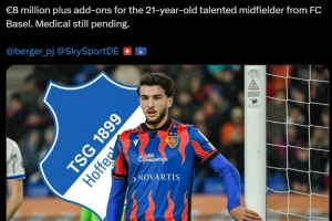 报道称霍芬海姆将为这位21岁天才中场球员支付的转会费为800万欧元,外加附加奖金。他即将进行加盟前的体检。