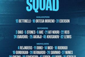 中场:4-赖因德斯、11-多库、14-尼科-冈萨雷斯、16-罗德里、19-京多安、20-B席、26-萨维尼奥、27-努内斯、29-切尔基、30-埃切维里、47-福登、52-鲍勃、75-奥赖利;