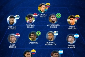 中场:恩西索(巴拉圭)、卡塞米罗(巴西)、本坦库尔(乌拉圭)、阿尔马达(阿根廷)