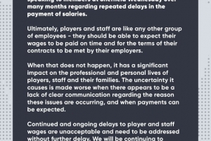 当这未能实现时,它对球员、工作人员及其家人的职业和个人生活都会产生重大影响。这种不确定性在缺乏关于这些问题发生原因的明确沟通,以及何时能收到薪资的预期时,会变得更加严重。
