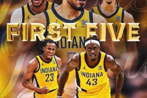 步行者本场比赛先发为:哈利伯顿、内姆哈德、内史密斯、西亚卡姆、特纳。