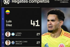 体育资讯6月12日讯 Sofascore统计了本届南美世预赛球员成功过人的次数,并列出榜单,迪亚斯41次居首,梅西、M-阿劳霍27次第二。