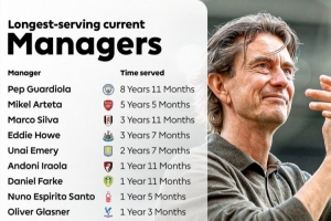 据英超官方统计,瓜迪奥拉是当前执教时间最长的主帅,阿尔特塔次席,马尔科-席尔瓦第三。