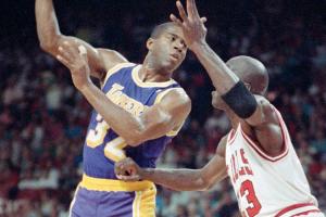 魔术师:“一个去到客场,就能够让客场球票售罄的球员。超级巨星就是,会让你从办公室跑着回到家,说‘我必须要在电视上看他表演’的那种人。拉里-伯德,人们都是跑着回家去看他,巴克利、奥尼尔、科比,然后当然是历史上最伟大的迈克尔-乔丹,人们都是尽全力想要来到球馆,看他们表演。”