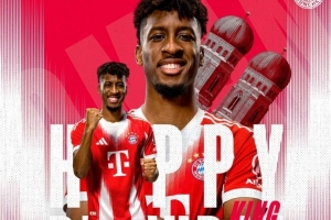 拜仁官方社媒晒出为科曼制作的海报,配文:“科曼今天迎来了他的29岁生日,生日快乐,国王(双关Kingsley )。”