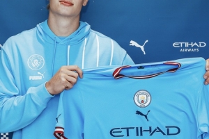 曼城晒出了哈兰德当初的加盟照,写道:“2022年的今天,我们签下了从小就是蓝月亮球迷的哈兰德。”