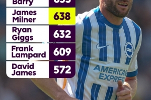 体育资讯6月13日讯 布莱顿官方宣布与米尔纳续约一年,英超官方也晒出联赛历史出场次数榜,其中米尔纳据榜首还有15场差距。