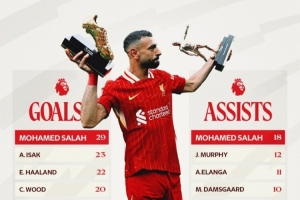 32岁的萨拉赫24-25赛季出战38场英超,贡献29球18助攻,两项数据均是英超球员中最多。