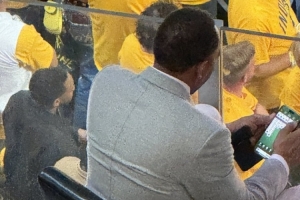 体育资讯6月14日讯 NBA总决赛G4,雷霆111-104战胜步行者。比赛过程中,A-史密斯在观众席上玩起了纸牌游戏。