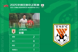在2025华润饮料中乙联赛第13轮比赛中,山东泰山B队客场对阵湖北青年星。比赛第38分钟,山东泰山B队球员彭啸主罚任意球直接破门,帮助球队扳平比分;第84分钟,彭啸接到队友头球后左脚抽射破门,贡献第二粒进球,助力球队2-1战胜对手。