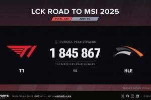体育资讯6月15日讯 2025LCK MSI选拔赛最后一轮T1以3比0战胜HLE获得MSI门票,这场比赛刷新了MSI选拔赛海外收视率峰值,高达1845867。这也超过了LCK常规赛第一轮T1 VS GEN1564582的收视率峰值。