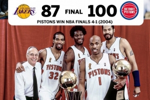 体育资讯6月16日讯 2004年的今天,活塞在总决赛G5以100-87击败湖人,大比分4-1夺得总冠军。