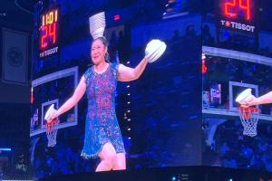 Red Panda,本名牛蓉,从1993年开始为NBA进行中场表演杂技顶碗,至今已经有32年
