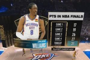 值得一提的是,总决赛五场,杰伦威的得分是一场比一场高:G1-17分、G2-19分、G3-26分、G4-27分、G5-40分!