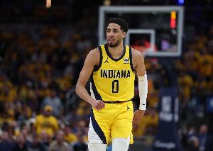 据统计,这是哈利伯顿季后赛生涯首次单场无运动战进球!