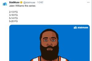 值得一提的是,在第二轮对掘金的系列赛中,美媒StatMuse甚至将他的拉胯数据配上了哈登的图片,以此来嘲讽他。