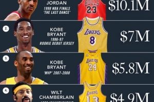 第一是乔丹1998年总决赛“最后一舞”的球衣,1010万美元;