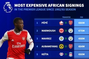 体育资讯6月17日讯 近日,德转官方总结了进去英超时代后非洲球员转会费最高的10名球员,其中尼古拉斯-佩佩以8000万欧居首,马尔穆什、马赫雷斯分别以7500万欧和6800万欧列二三位。
