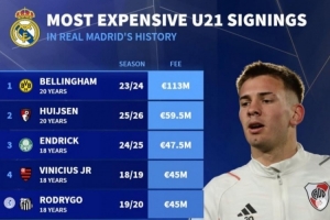体育资讯6月17日讯 德转列皇马U21球员引援花费排行,贝林厄姆1.13亿欧居首,马斯坦托诺与维尼修斯、罗德里戈并列第四。