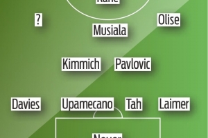 诺伊尔;阿方索-戴维斯、于帕梅卡诺、塔、莱默尔;基米希、帕夫洛维奇、待引进的左边锋、穆西亚拉、奥利塞、凯恩