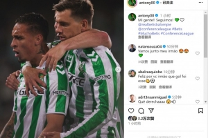 赛后安东尼连发两条社媒,他晒出庆祝进球的照片,配文“进球献给我的小家伙们,洛伦佐和佩德罗-恩里克!”、“兄弟们,我们继续冲!”