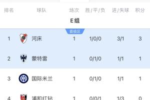 体育资讯06月18日讯 E组两场比赛战罢,河床3-1浦和红钻,国米1-1战平蒙特雷。