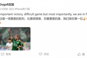 赛后,古加更新社媒庆祝球队赢球,他配文写道:这是一场重要的胜利,比赛很艰难,但最重要的是,我们排在第一位。