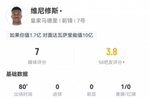 体育资讯6月19日讯 新世俱杯首轮,皇马暂1-1新月。此役维尼修斯首发80分钟被换下,球员全场重点数据如下↓