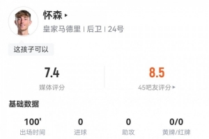 上一篇: 皇马1-1新月数据:射门19-13,射正7-2,得分机会4-2,角球5-6
